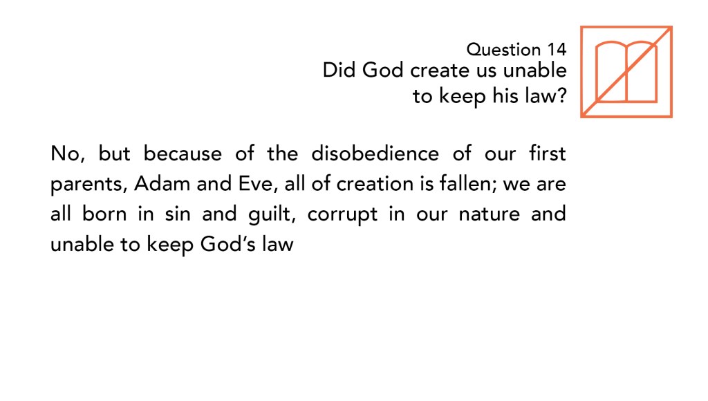 Because of Adam’s original sin, we are all born in sin and guilt, corrupt in our nature and unable to keep God’s law. With his choice to rebel against God in the garden, all of humanity lost the ability to obey God’s law. To support this Scripturally, we could easily cite Romans 8:7-8 and Ephesians 2:1-3 as we did in Question 13, but for brevity’s sake, I will only repeat the former: