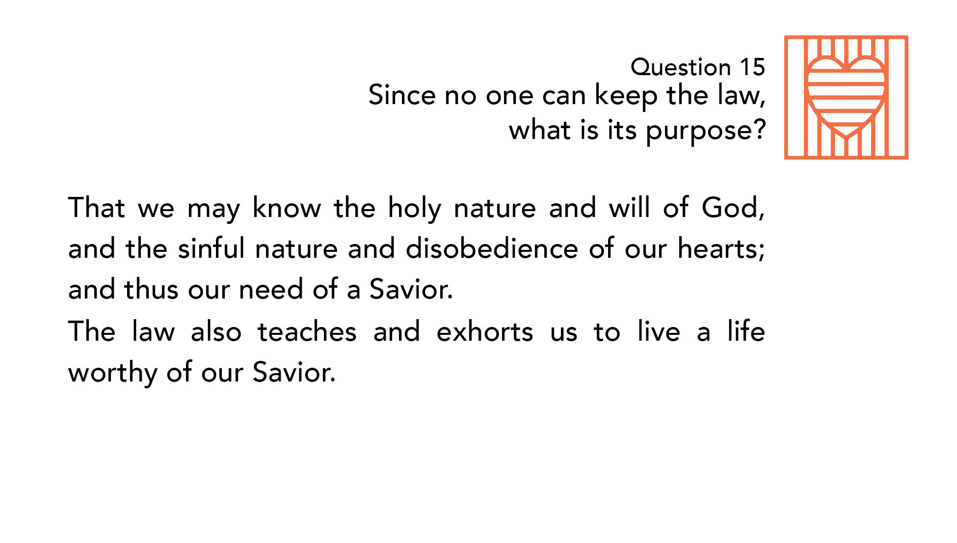 The law’s third purpose reminds us that we do indeed have such a Savior and that the law also teaches and exhorts us to live a life worthy of Him. In both the Westminster and Heidelberg Catechisms, the Ten Commandments are presented towards the end as a portrait of how the life of a Christian ought to be lived in obedience to God and in thankfulness to Christ Jesus our Lord. I would imagine that it has been placed here towards the beginning of the New City Catechism because the Ten Commandments are not as commonly known today as they once were. Thus, most people today need a presentation of them to know exactly why they need a Savior in the first place. I agree with that decision; however, we should diligently note that the law is not merely to display our need of a Savior but to also show us how to live a life worthy of that same Savior.