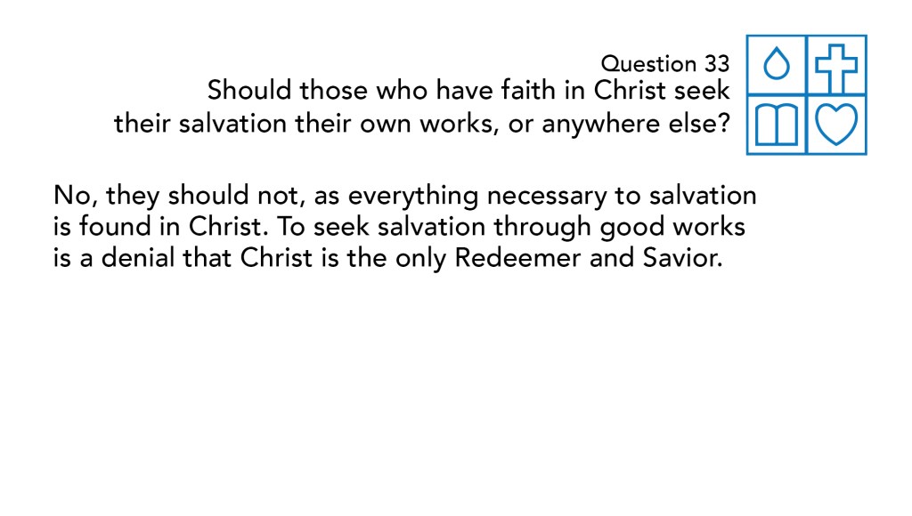 While the complete sufficiency of Christ for salvation is not a newly introduced idea, we should note the progression that we find in the catechism. Questions 20-25 all addressed what foundation we have for believing in the all-sufficiency of Christ’s redemption, particularly that He alone is both truly God and truly human, making Him the only sufficient mediator between both God and man. We then moved on to describing what faith in Christ is. Now notice that this question is particularly about those who have already professed faith in Christ: Should those who have faith in Christ seek their salvation through their own works, or anywhere else? In other words, this question is concerned with establishing the sufficiency of Christ not only for our justification but also for our sanctification. Therefore, the catechism rightly answers: