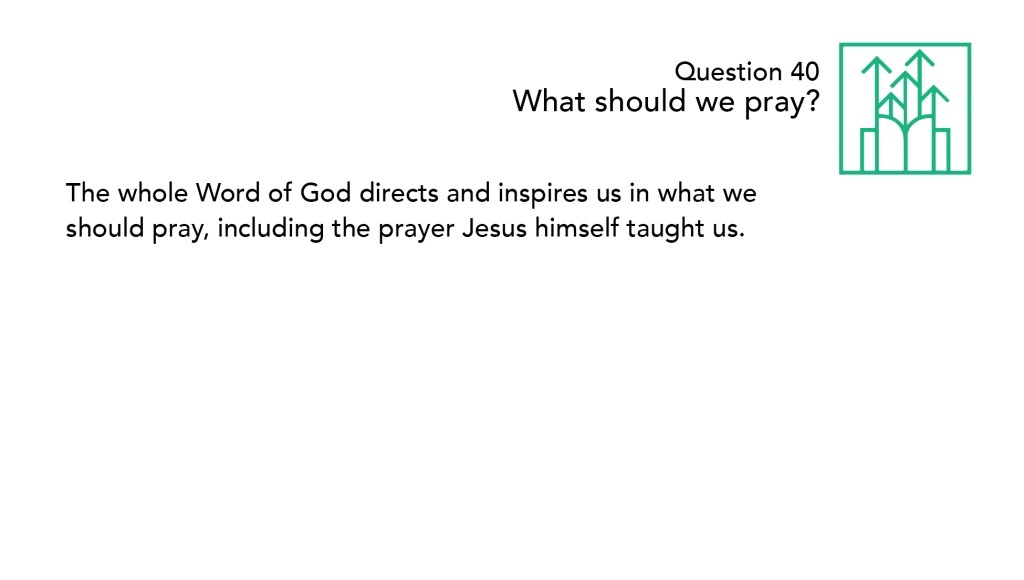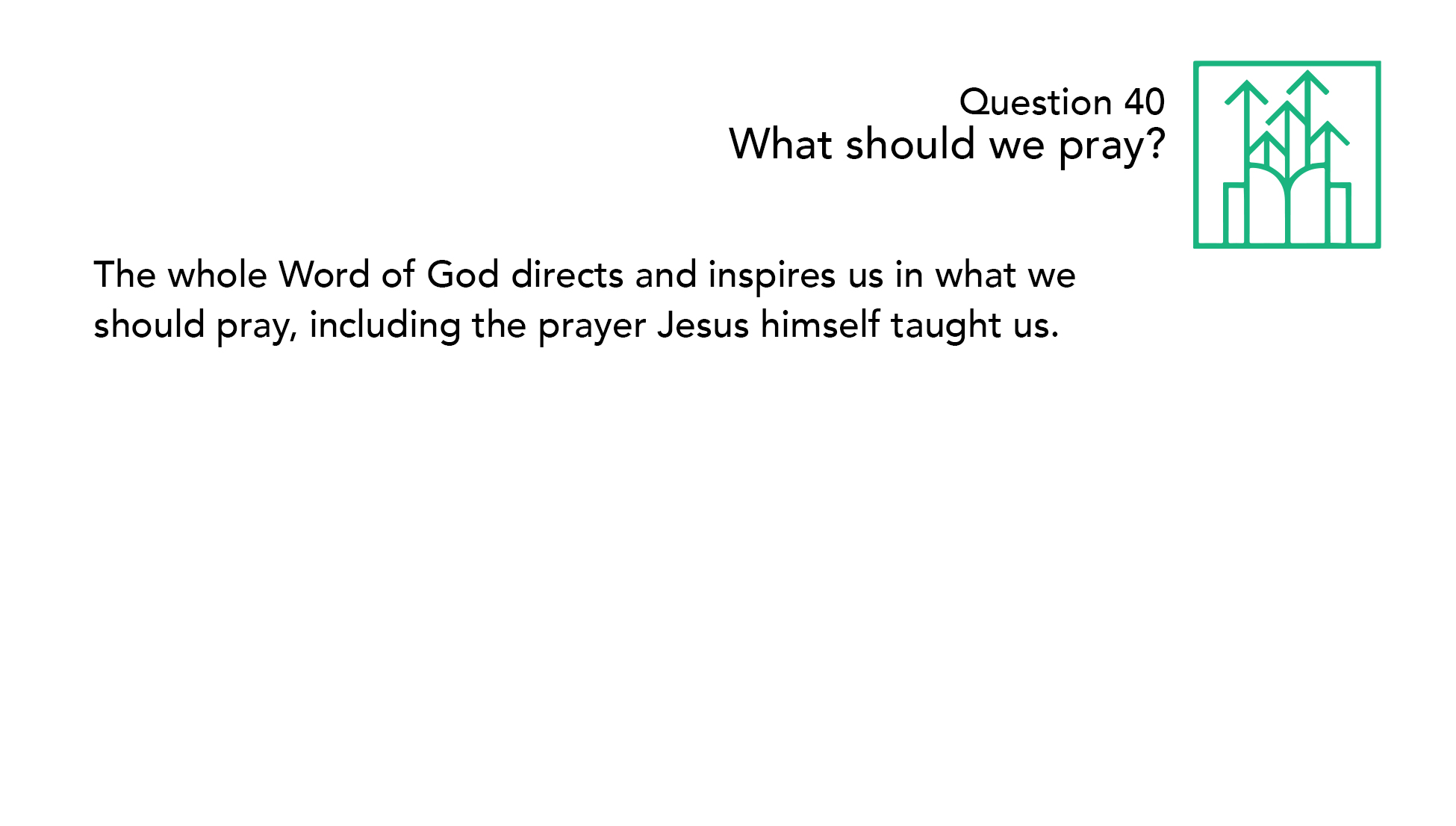 The answer rightly sets our sights upon the Scriptures: The whole Word of God directs and inspires us in what we should pray. Praying in accordance with God’s will ought to be our supreme desire, and God’s will is revealed to us through His written Word. When we pray Scripture, we are praying God’s Word back to Him. Thus, prayer is not a discipline that stand opposite to or in isolation from the reading of Scripture; instead, prayer and Bible reading ought to flow seamlessly into one another. Our Bible reading ought to shape our prayers, and our prayers ought to move us into reading the Bible.