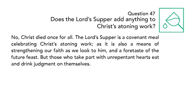In the same way, this question asks whether the Lord’s Supper adds anything to Christ’s atoning work. Again, the answer is no. Christ died once for all. This language comes directly form the book of Hebrews. He died one time, for all His people and for all their sins. Nothing more needs to be done for us to receive forgiveness. Christ has completed that work.