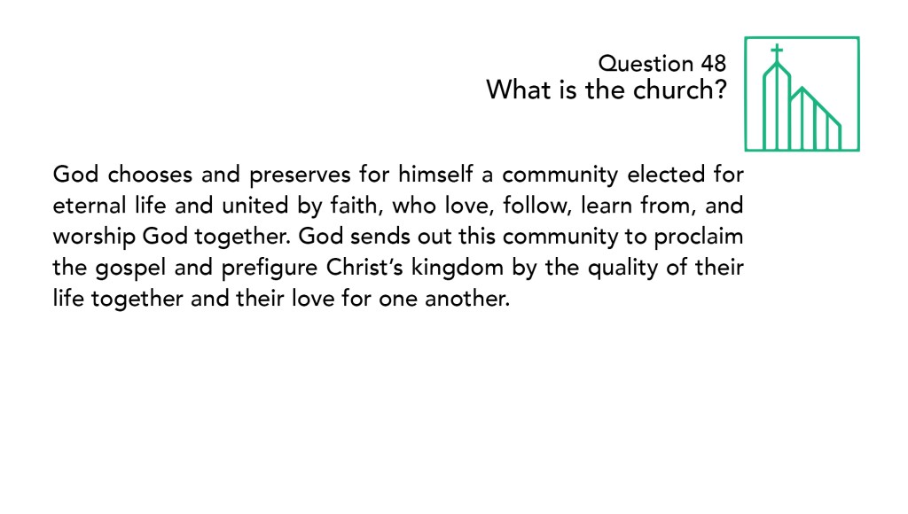 But this community also has an outward focus. God sends this community to proclaim the gospel and to prefigure Christ’s kingdom by the quality of their life together and their love for one another. To prefigure the kingdom means that the church gives the world a preview (partial and imperfect though it may be) of what God’s kingdom will one day be in its fullness. Christ’s kingdom is truly present, but it is not of this world. But we still pray, “Your kingdom come,” because its fullness is still to come. Thus, as citizens of that kingdom, the church is called to embody its values now, even as we wait for the day when Christ returns to make all things new.
