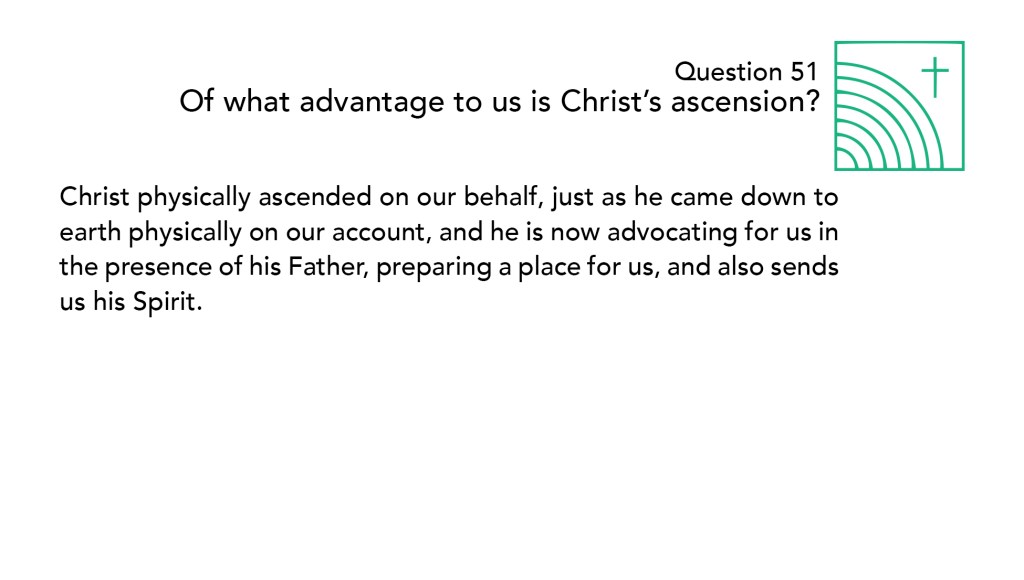 In John 16, Jesus explicitly tells His disciples: “it is to your advantage that I go away” (v. 7). The ascension is not Christ abandoning His people but advancing His work for us. The catechism then lists three benefits of Christ’s ascension.